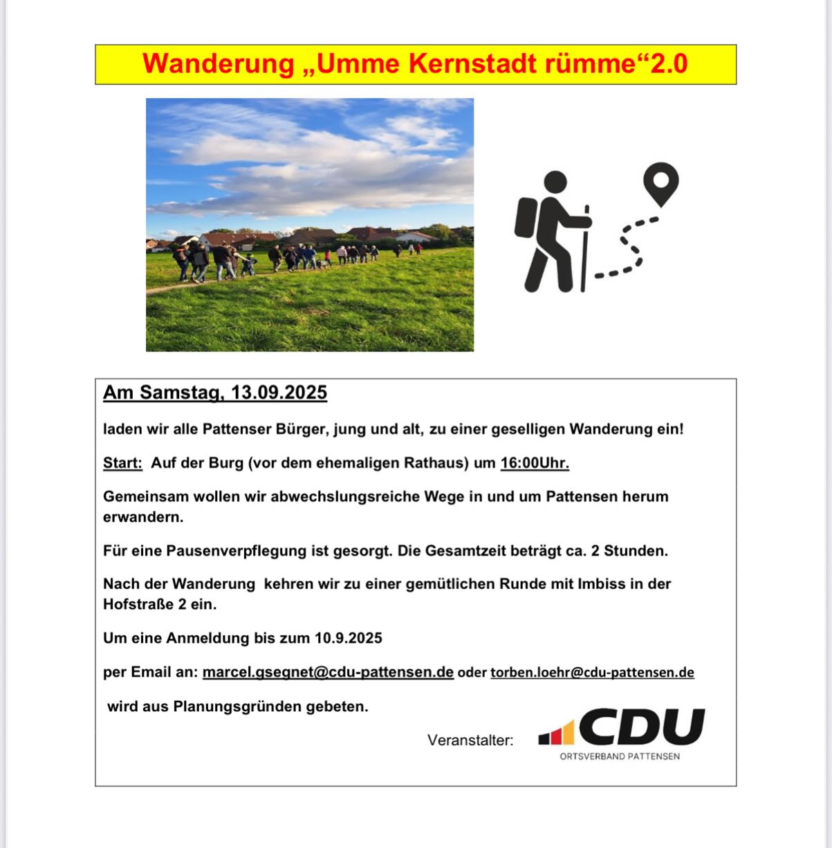 mehr🔹 Einladung zur Wanderung "Umme Kernstadt rümme" durch unseren Ortsverband Pattensen-Mitte 🔹 Am Samstag 13.09.2025 lädt unser Ortsverband Pattensen-Mitte erneut alle Pattenser Bürger, jung und alt, zu einer geselligen Wanderung "Umme Kernstadt rümme" ein. Start: Auf der Burg (vor dem ehemaligen Rathaus) um 16:00 Uhr Gemeinsam wollen wir den abwechslungsreichen Weg mit den verschiedenen Stadtansichten erwandern. Für eine Pausenverpflegung ist gesorgt. Die Gesamtzeit beträgt ca. 2 Stunden. Nach der Wanderung laden wir Sie und Euch zu einer gemütlichen Runde mit Imbiss in der Hofstraße 2 ein. Um eine Anmeldung bis zum 10.9.2024 per Email an: marcel.gsegnet@cdu-pattensen.de oder torben.loehr@cdu-pattensen.de wird aus Planungsgründen gebeten . #pattensen #engagiertvorort #wanderung #gesellig #cdu
