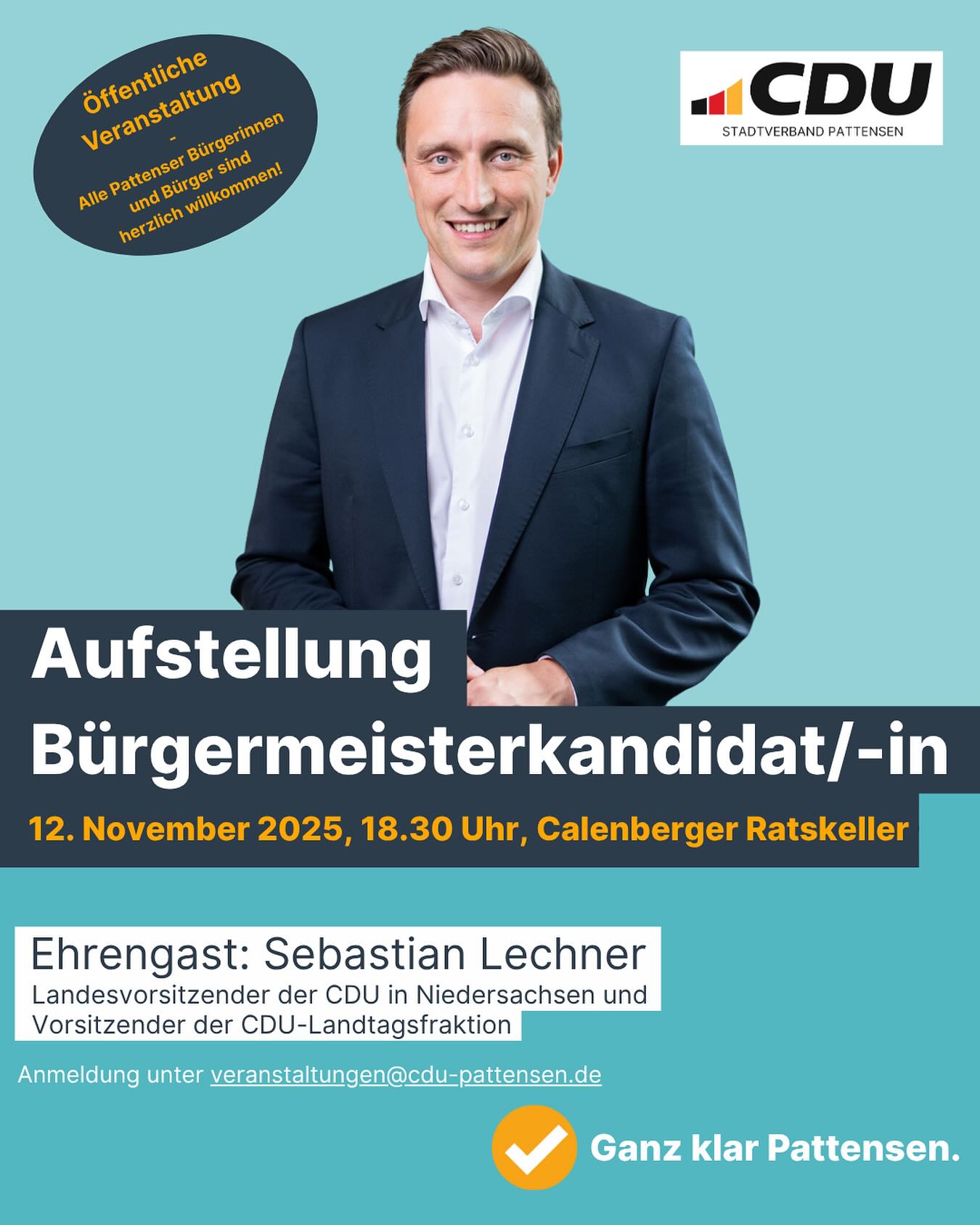 📣 Gemeinsam Zukunft gestalten ? für Pattensen! 🌟 Am 12. November 2025 stellen wir unsere Bürgermeisterkandidatin bzw. unseren Bürgermeisterkandidaten für die Wahl am 13. September 2026 auf. Ein großer Moment für unseren Stadtverband ? und ein wichtiger Schritt für die Zukunft unserer Heimat. 🙌✨ 📍 Calenberger Ratskeller, Marktplatz 1, Pattensen 🕡 Beginn: 18:30 Uhr Wir freuen uns riesig, an diesem besonderen Abend Sebastian Lechner, den Landesvorsitzenden der CDU Niedersachsen, begrüßen zu dürfen! 🤝 Alle Pattenserinnen und Pattenser sind herzlich eingeladen, an diesem Abend teilzunehmen und unsere Kandidatin bzw. unseren Kandidaten kennenzulernen. 👉 Anmeldung bitte an: veranstaltungen@cdu-pattensen.de #CDUPattensen #GemeinsamFürPattensen #CDU #Bürgermeisterwahl2026 #TeamCDU #ZukunftGestalten #Heimat #sebastianlechner